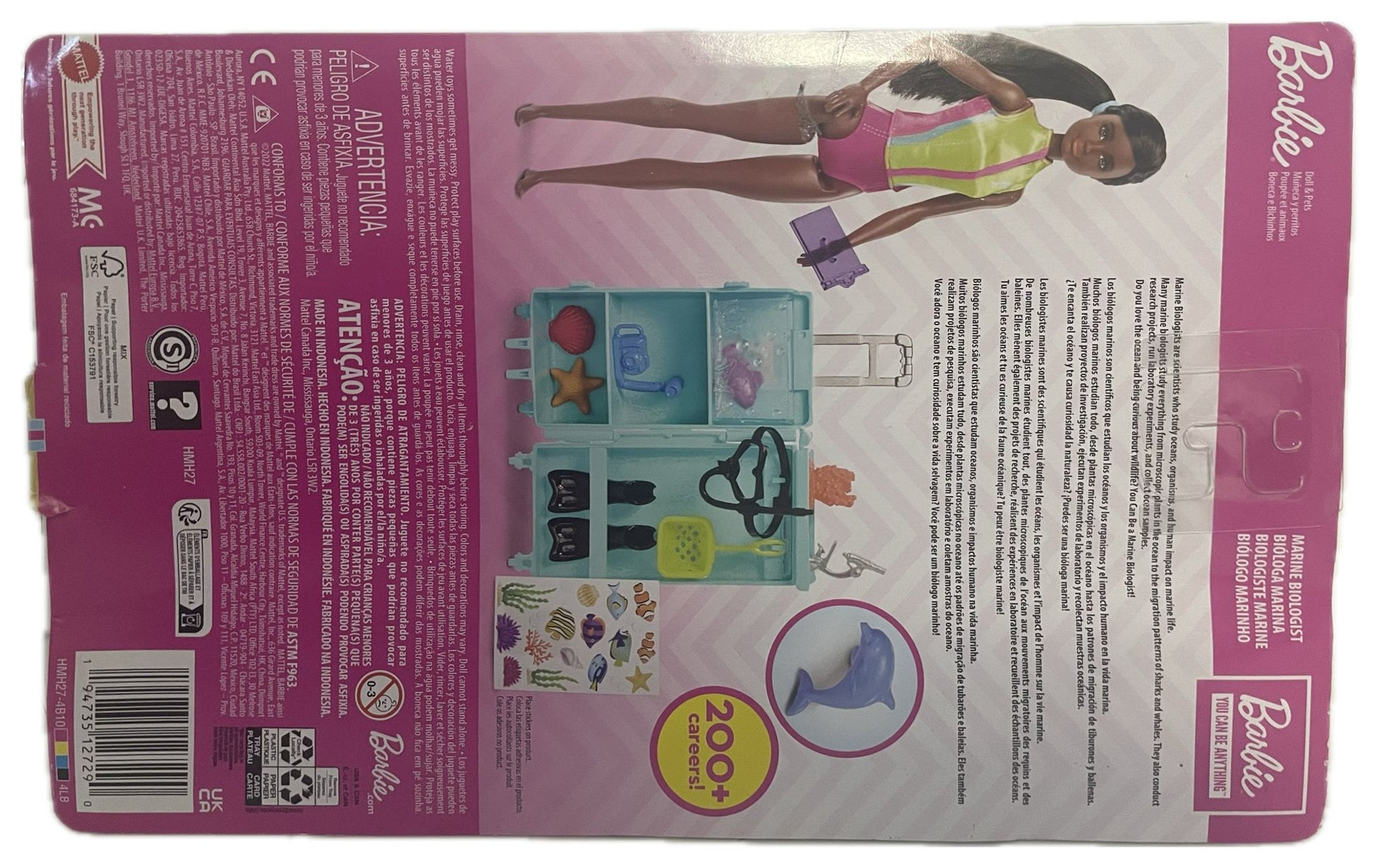 Included Items: 1 brunette Barbie doll in wetsuit, mobile lab case, snorkel mask, swim fins, microscope, net, camera, clipboard, sticker sheet, marine life figures (fish, dolphin, coral, etc.), and other small accessories (10+ total)